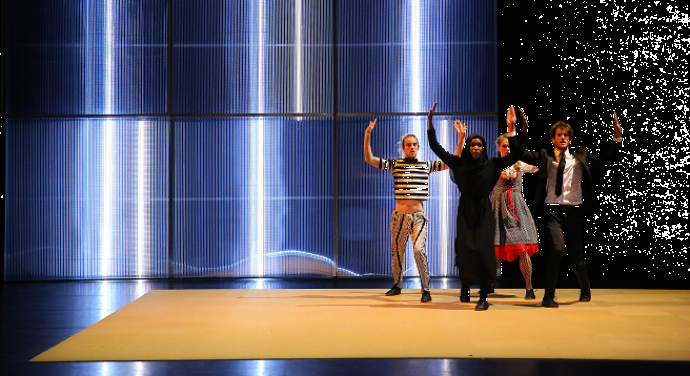 6: THE SQUARE zooms in on mankind’s need to create order in a continually changing world: marking out, creating frameworks, drawing boundaries, pigeon-holing; square. What role does this man-made shape play in our society? In a festive ritual, eight dancers and one actress lead you through an impalpable landscape of possibilities.